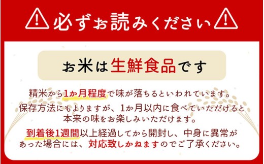 | 消費期限 | 精米から1か月程度(高温多湿の場所を絶対に避け、冷蔵庫の野菜室などの冷暗所に保存してください) |