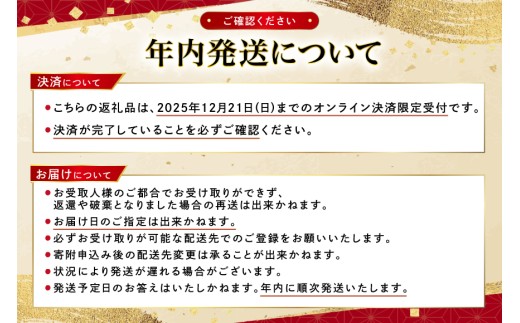 | 発送期日 | 【年内に発送】※申し込み期日:2025/12/21(決済完了確認)