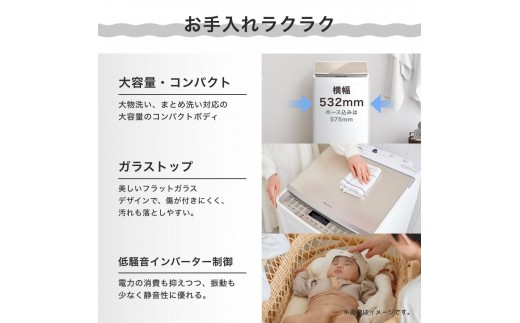 ★【低騒音インバーター制御】洗濯物の量に応じて洗濯機のモーターの働きを自動で調整して電力の消費を抑えます。また振動も少なく低騒音なので早朝や夜間の洗濯も安心です。