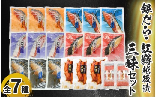 大型で脂ののった銀だらの辛味醤油漬と五ツ星お米マイスターがつくった新潟県産こしひかり原料の塩こうじで漬けた鮭の詰め合わせ。