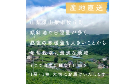 標高約600m付近にある山梨県牧丘町は巨峰の栽培に適した水はけの良い土質と昼夜の寒暖差を有しています。