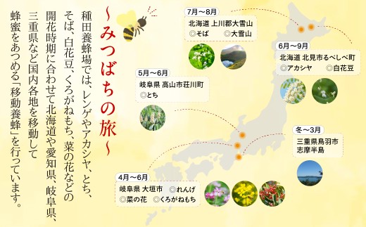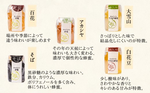 全9種(菜の花・れんげ・もち・とち・百花・アカシヤ・大雪山・そば・白花豆)
