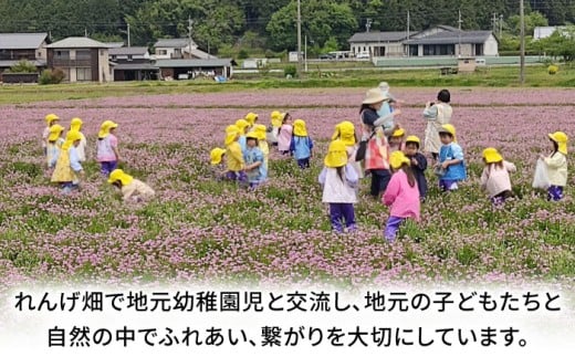 苗を植える前にれんげ畑を作り、空気中の窒素を土壌に固定し肥料として利用する昔から伝わる「れんげ農法」にて栽培しています。