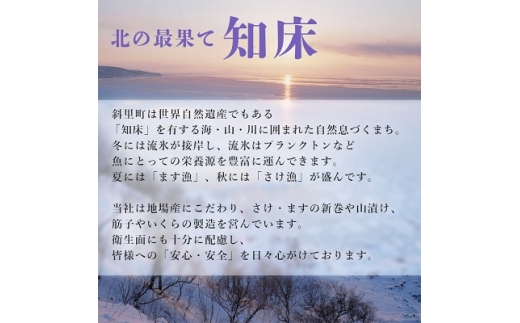 『鮭いくら醤油漬け』『鮭親子漬』は世界自然遺産知床・斜里町において”真の知床産”の優れた製品のみが認証される『 知床しゃりブランド認定品 』として認証されています。