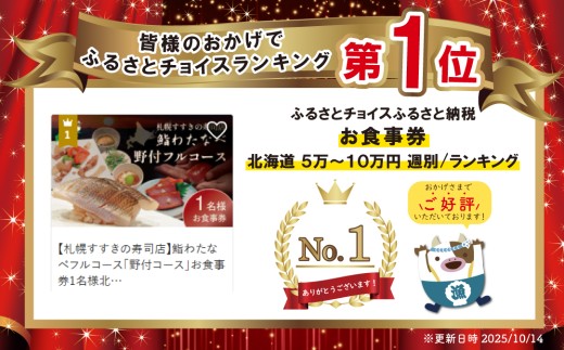 御礼!ランキング第1位獲得!【札幌すすきの寿司店】鮨わたなべフルコース「野付コース」お食事券1名様北海道【SW0000001】(鮨わたなべ 別海店)(食事券 お食事券 食事券チケット 食事チケット 札幌市 札幌 ディナー 鮨 寿司 お寿司 お鮨 和食 ふるさとチョイス ふるさと納税 仕組み キャンペーン 限度額 計算 ランキング やり方 シミュレーション チョイス チョイスマイル )