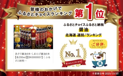 御礼!ランキング第1位獲得!あさり醤油4本・しまえび醤油4本 【各200ml】【BK0000007】 ( ふるさと納税 しょうゆ 醤油 ふるさと セット 詰め合わせ 詰合せ えび エビ 海老 北海シマエビ 北海しまえび シマエビ しまえび あさり アサリ 北海道 野付 )