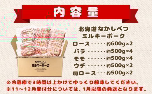北海道中標津産 ミルキーポークたっぷりセット(計7.2kg) ロース 120g×5枚×2 肩ロース 約500g×2 ウデ 約500g×2 バラ 約500g×4 モモ 約500g×4 豚肉 豚 肉 お肉 ミルキーポーク ポーク 冷凍 冷凍肉 国産豚肉 国産 お取り寄せ ふるさと納税 北海道 中標津町 中標津【15004】