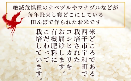 絶滅危惧種のナベヅルやマナヅルなどが毎年飛来し寝どこにしている田んぼで作られたお米です。