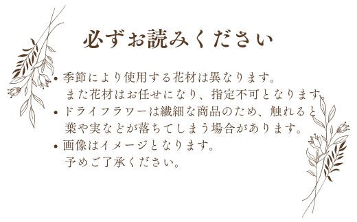 ・ドライフラワーは高温多湿や、直射日光の当たる場所を嫌います。繊細なものですのでお取り扱いにも十分ご注意ください。