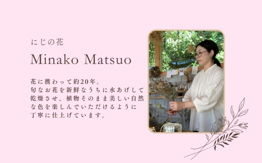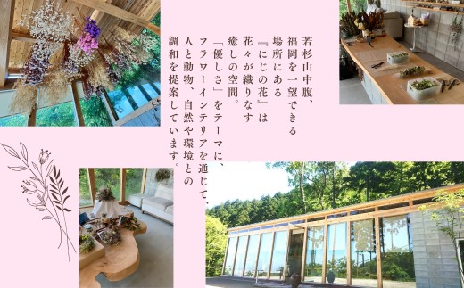 ドライフラワーは「永遠の愛」や「永遠の友情」花言葉をもち、これは言い換えると「いつまでも大切な家族を想う」ということに繋がるのではないかなと考えています。私たちの束ねるドライフラワーで皆さんに癒しや安らぎがお届けできたら嬉しく思います。ブライダルシーンにも良く合うものですのでご予定のある方はぜひご選択ください。