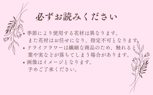 ・ドライフラワーは高温多湿や、直射日光の当たる場所を嫌います。繊細なものですのでお取り扱いにも十分ご注意ください。