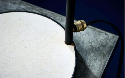 ライトの台座には、唐臼の下にある粉砕された陶土や川の石、小鹿田焼の残土を利用し、左官職人が伝統工法を用いて仕上げの風合いを追求しました。