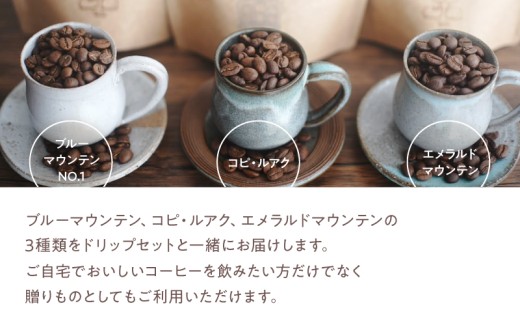 ブルーマウンテン、エメラルドマウンテン、コピルアクの3種類をドリップセットと一緒にお届けしますので、ご自宅でおいしいコーヒーが飲みたい方だけでなく、贈りものとしてもご利用いただけます。