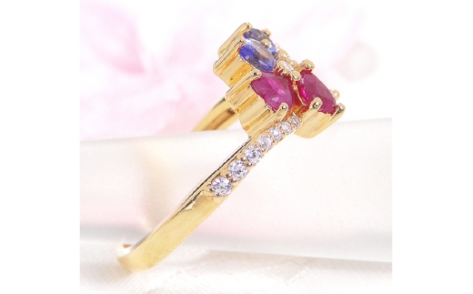 艶やかなK18イエローゴールドに、3種類のジュエル(ルビー・タンザナイト・ダイヤモンド)がきらめくお洒落な花束モチーフリング。