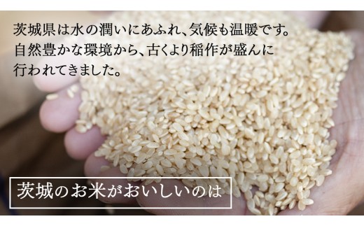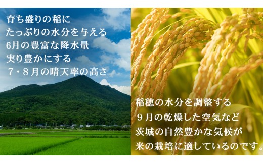 茨城県は久慈川、那珂川、小貝川、鬼怒川、利根川などの水の潤いにあふれ、気候も温暖です。自然豊かな環境から、古くより稲作が盛んに行われてきました。茨城のお米がおいしいのは、育ち盛りの稲にたっぷりの水分を与える6月の豊富な降水量、実り豊かにする7・8月の晴天率の高さ、稲穂の水分を調整する9月の乾燥した空気など、自然豊かな気候が米の栽培に適しているためです。