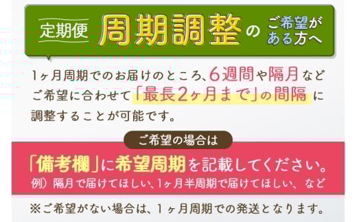 ご希望の場合はお申込の際に「申し込みに関する備考」へ希望周期を記載してください。 例)隔月で届けてほしい、1ヶ月半周期で届けてほしい、など ※ご希望がない場合は、1ヶ月周期にて発送します。 ■■*3*■■ お届け時期の延長サービスについて 定期便1回目をお受取後、最終回お届けまでの間で「合計6ヶ月」お届け時期の延長が可能でございます。 ---