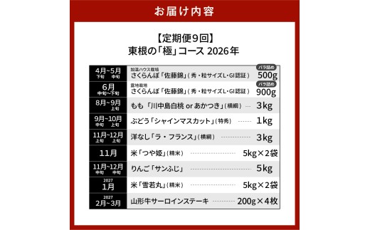 【2026年先行予約 9回 定期便】山形県 東根市産「極」コース さくらんぼ 桃 シャインマスカット りんご ラ・フランス お米 肉 hi999-038