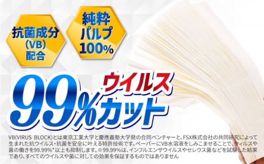 ペーパーにVB水溶液をしみこませることで、ウィルスや菌の働きを99.99%*以上も抑制します。