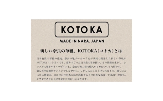 奈良県大和郡山市は日本有数の革靴の産地。この地で昔からひたむきに革靴作りに向き合ってきた靴メーカー7社が共同開発した革靴「KOTOKA」はシンプルで履きやすいデザインが特徴。甲革に鎌倉時代に遡る歴史を持つ日本最大の革の産地、兵庫県たつの市で、特に丁寧な加工で評価の高いタンナー「マルヒラ」で、植物タンニンで二次なめしされた革を使用。製造過程で通常2回使用するドラムを、なめし、染め、蝋引き、揉みの計4回使用し、手間をかけてつくられた革です。色ムラやシワが、履くほどに深味わいを醸し出します。古都ラインの靴はこの革の風合いを生かした、シンプルで履きやすく、飽きのこないデザインの靴です。