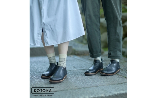 奈良県大和郡山市は日本有数の革靴の産地。この地で昔からひたむきに革靴作りに向き合ってきた靴メーカー7社が共同開発した革靴「KOTOKA」はシンプルで履きやすいデザインが特徴。甲革に鎌倉時代に遡る歴史を持つ日本最大の革の産地、兵庫県たつの市で、特に丁寧な加工で評価の高いタンナー「マルヒラ」で、植物タンニンで二次なめしされた革を使用。製造過程で通常2回使用するドラムを、なめし、染め、蝋引き、揉みの計4回使用し、手間をかけてつくられた革です。色ムラやシワが、履くほどに深味わいを醸し出します。古都ラインの靴はこの革の風合いを生かした、シンプルで履きやすく、飽きのこないデザインの靴です。