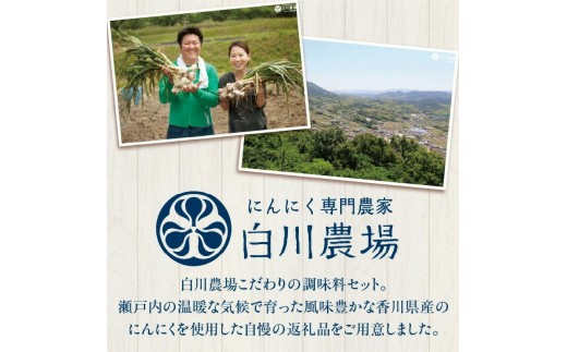 白川農場こだわりの調味料セット。瀬戸内の温暖な気候で育った風味豊かな香川県産のにんにくを使用した自慢の商品をご用意しました。