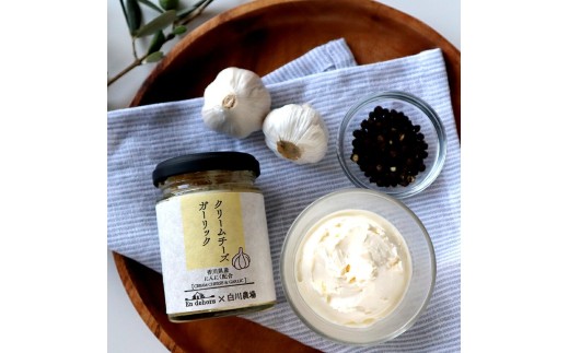 【甘熟黒にんにくクリームチーズ】クリームチーズ専門店「En dehors(アンディオール)」と当農場の黒にんにくがコラボしたコクと風味がミックスされた濃厚な甘みが特徴のクリームチーズ。製造より360日の賞味期限です。食後のにおいも気にならないので、そのまま食べるのはもちろん、塩気のあるパンやクラッカーなどに塗って食べたり、ホットミルクに溶かして飲んだり、アイスやパンケーキなどにのせて食べるのもおすすめの大人のデザート。【クリームチーズガーリック】白川農場が育てた香川県産にんにくとパンチの効いた黒コショウの辛味が特徴のクリームチーズ。料理に使いやすい味付けになっているのでサンドイッチやディップソースはもちろん、ネギやパセリを加えてクラッカーに塗ったらおつまみに。野菜にのせてオーブンで焼くのもおすすめ。