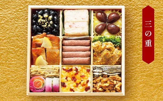 (三の重)金箔黒豆、ずわい蟹のテリーヌ、きんとんと渋皮栗、鶏のはちみつロースト レモン添え、ローストビーフ(ソース付)、菜の花福良漬、亜麻仁豚とパプリカのオリーブオイルソテー、たたきごぼう、彩りきぬた巻、フルーツチーズ、田作り、かつおくるみ