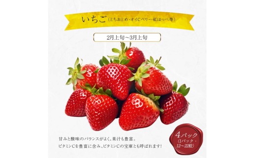 【1回目】いちご (とちおとめ ・オイCベリ-・紅ほっぺ等) 4パック (1パック:12~22粒) 2月上旬~3月上旬頃 冷蔵便でお届け予定