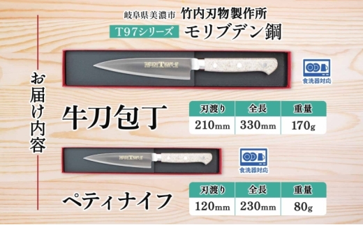 [№5308-0560]T97シリーズ牛刀 210mm ペティナイフ120mm 包丁 シェフナイフ ナイフ 食器乾燥機対応 食洗器対応 キッチン用品 調理器具 キッチングッズ 切れ味 錆びにくい 洋包丁 高品質 プロ仕様 耐久性 日本製 料理 送料無料 竹内刃物製作所 岐阜県 美濃市