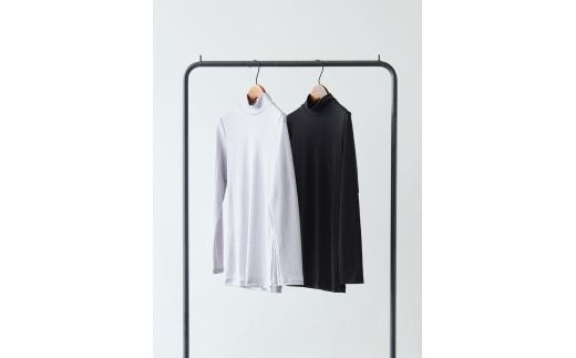 つまりすぎていない、ほどよくゆとりのあるハイネックのデザインは、カットソー感覚で着用していいただけます。この上にニットやカーディガンを重ねたり、レイヤードのベース服として活躍させてくださいね。袖は「クルーネック」のものよりも長めに、手首までしっかりと隠れる丈に。裾は少し長めになっているのもポイント。タートルネックニットなどの下に着用したとき、衿がのぞかないよう衿の高さは低めに設定しています。
