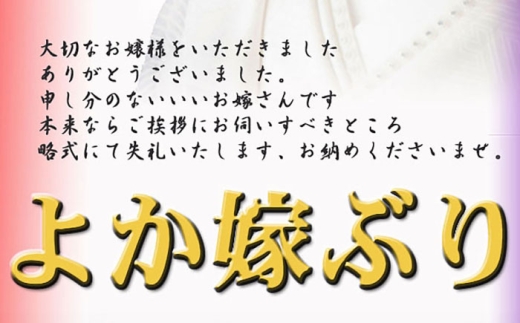また、お嫁さんっぷりがいい 、~っぷり、と正月には欠かせない寒ブリのぶりの語呂合わせで「よか嫁ぶり」「嫁ブリ」となっています。