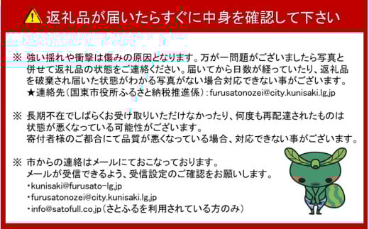 ※返礼品発送時期のご連絡などをメール配信にておこなっております。「furusatonozei@city.kunisaki.lg.jp」からのメールが受信できるよう、メール設定の確認をお願いいたします。