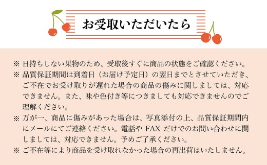 ※とてもデリケートな果物ですので、お受取後すぐに状態をご確認していただき、お早めにお召し上がりください。