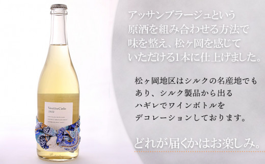 松ケ岡地区はシルクの名産地でもあり、シルク製品から出るハギレでワインボトルをデコレーションしております。どれが届くかはお楽しみ。